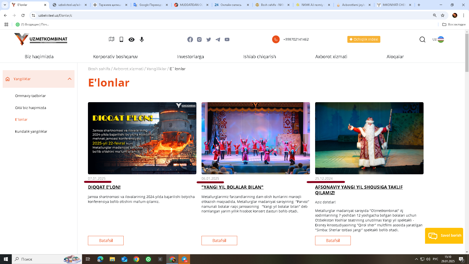 "O'zmetkombinat" AJ rasmiy veb-saytida axborotlarning sanasini ko'rish tartibi yaratilgan va barcha bo'limlarga joylashtirilgan