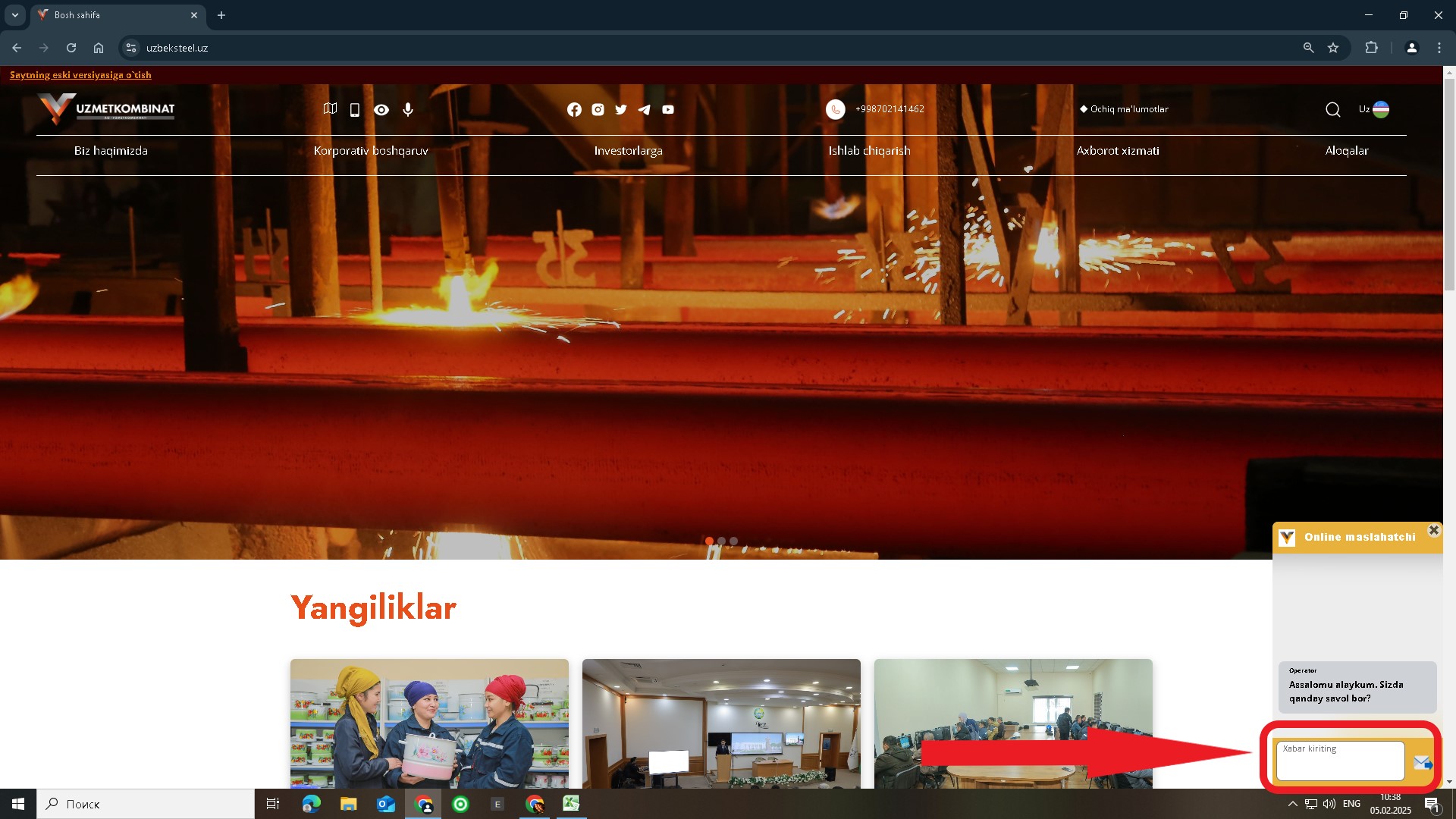"O'zmetkombinat" AJ rasmiy veb-saytida "Onlayn maslahatchi" xizmati yaratilgan va asosiy oynada joylashtirilgan