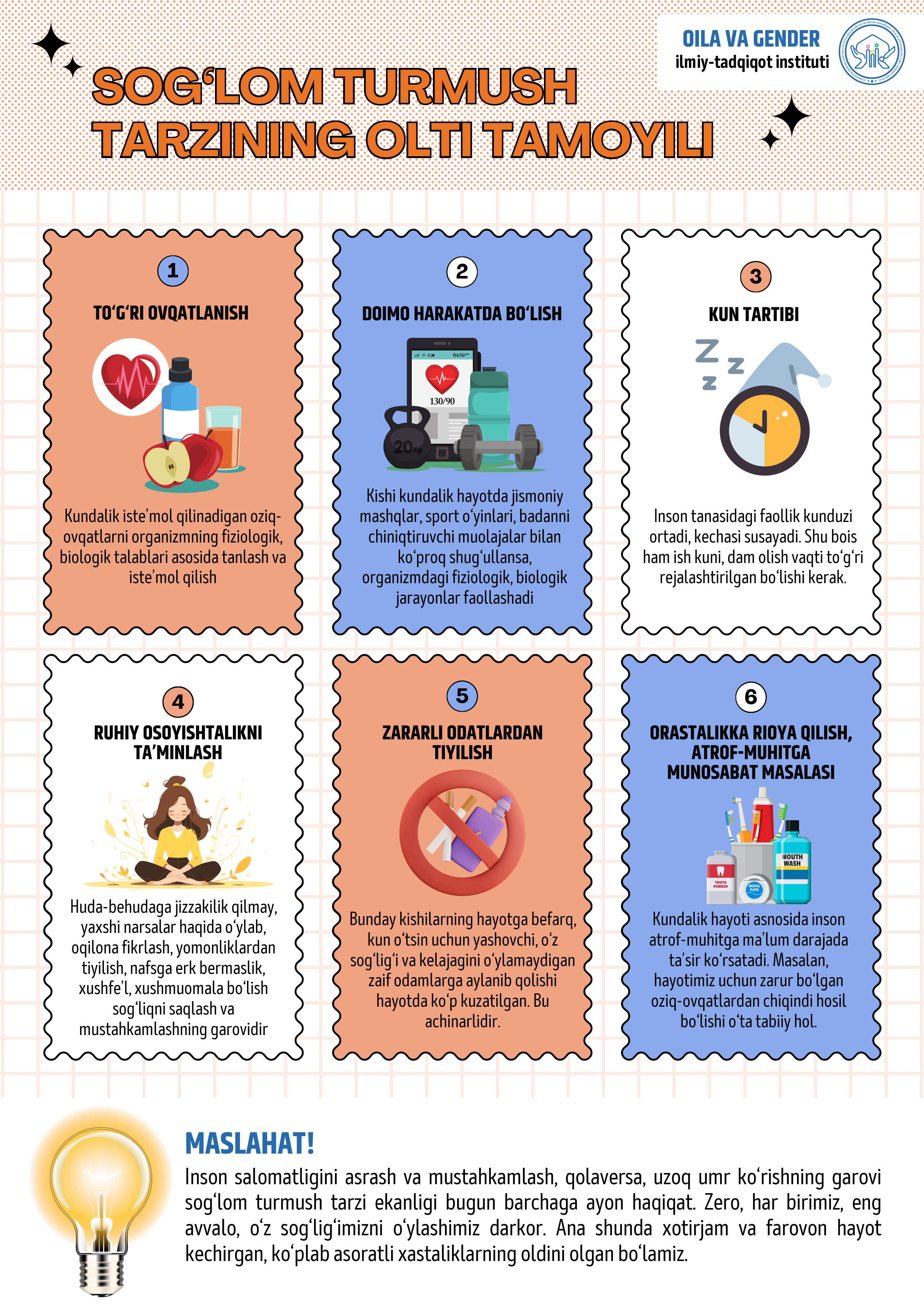 Inson salomatligini asrash va mustahkamlash, uzoq umr ko‘rishning eng ishonchli yo‘li — sog‘lom turmush tarzidir. Sog‘lom hayotni bugundan boshlaylik!