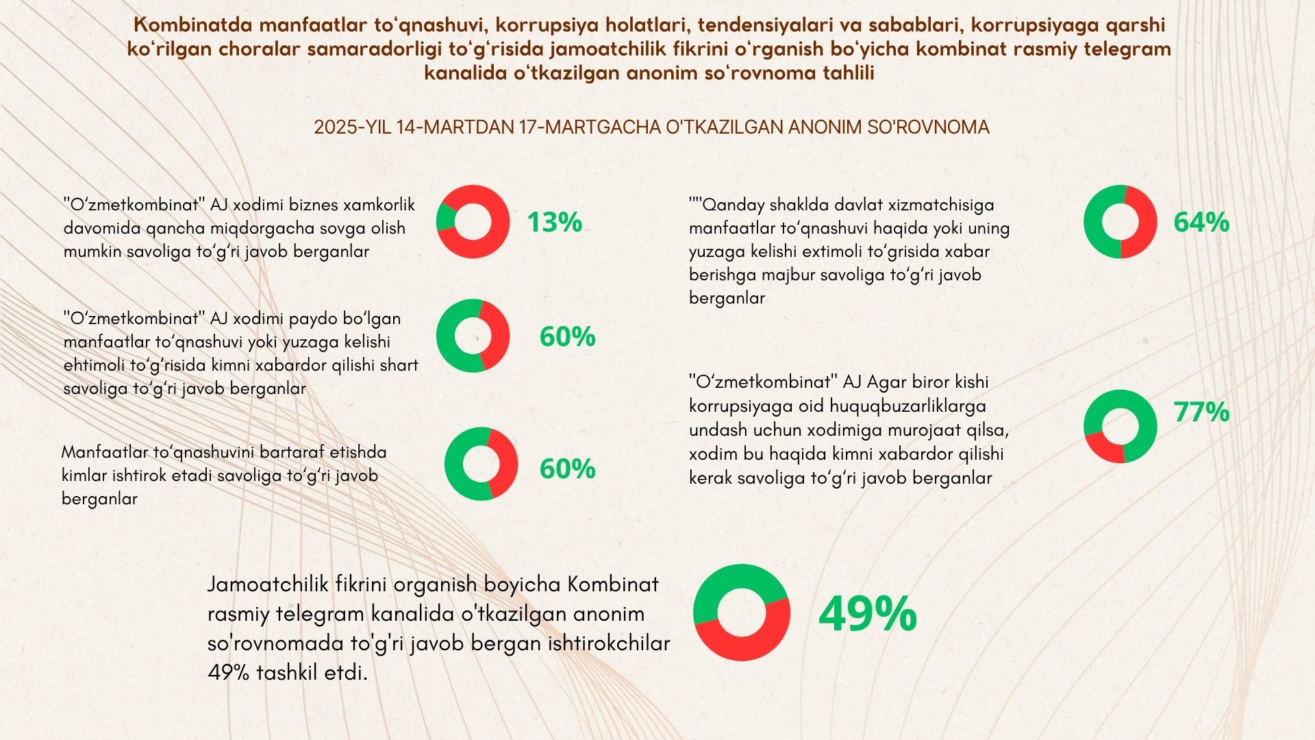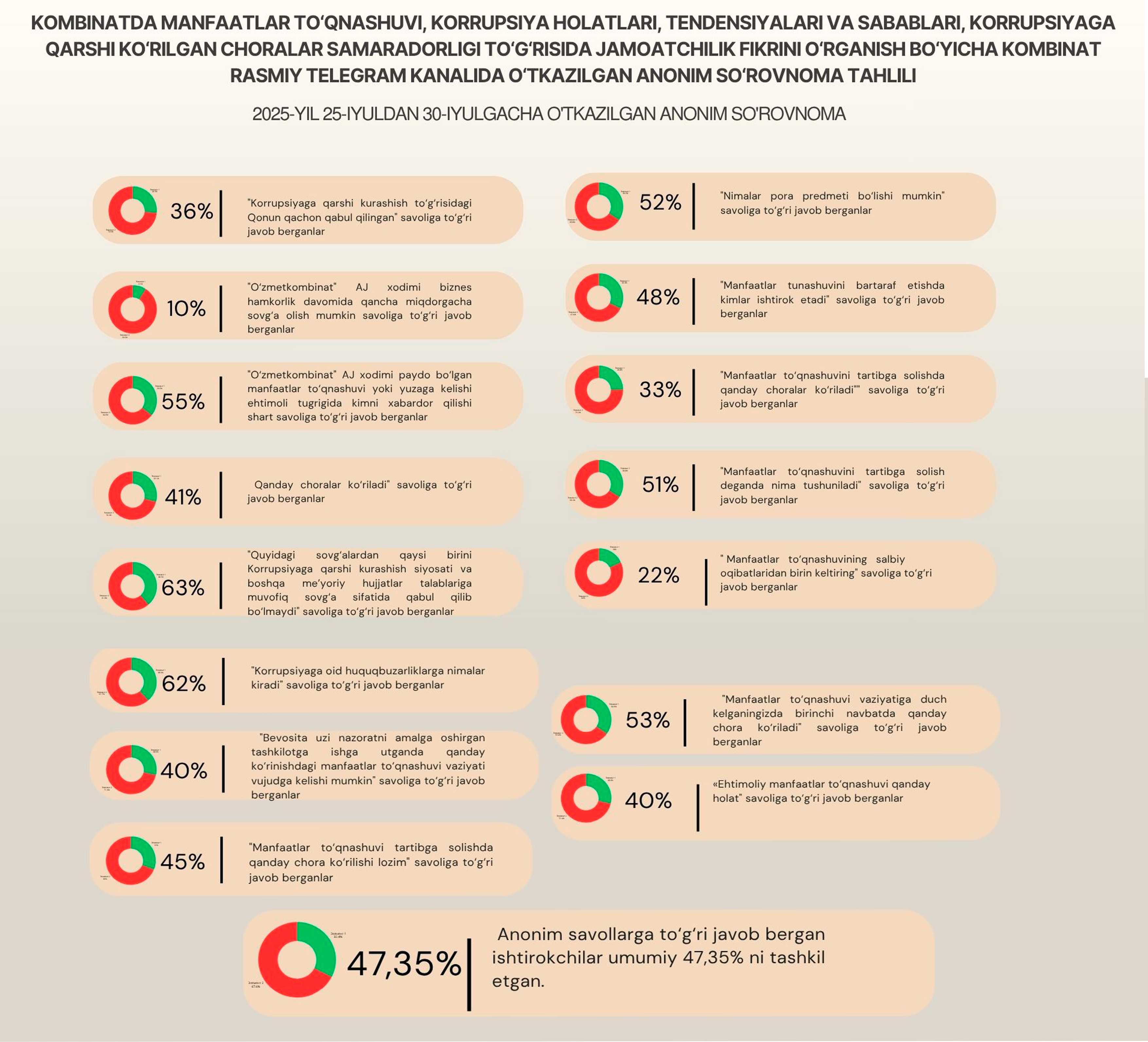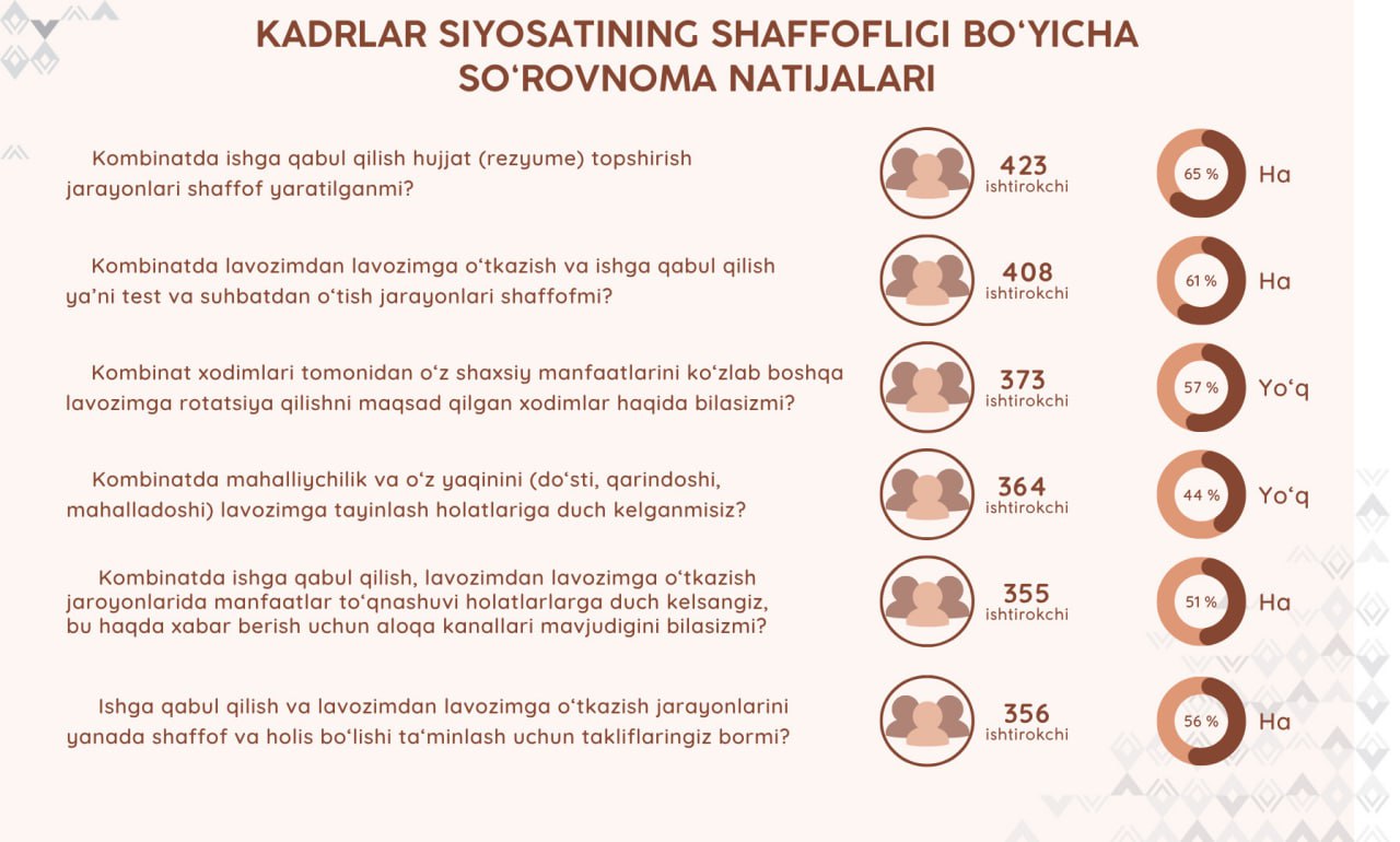 Kombinatda manfaatlar toʻqnashuvi, korrupsiya holatlari, tendensiyalari va sabablari, korrupsiyaga qarshi koʻrilgan choralar samaradorligi toʻgʻrisida anonim so'rovnoma natijalari (2024-yil avgust)
