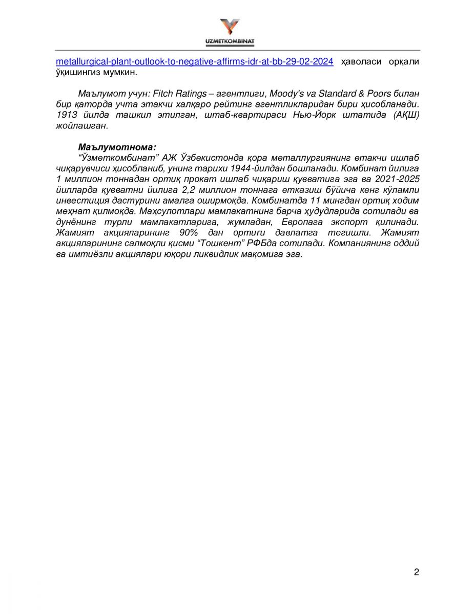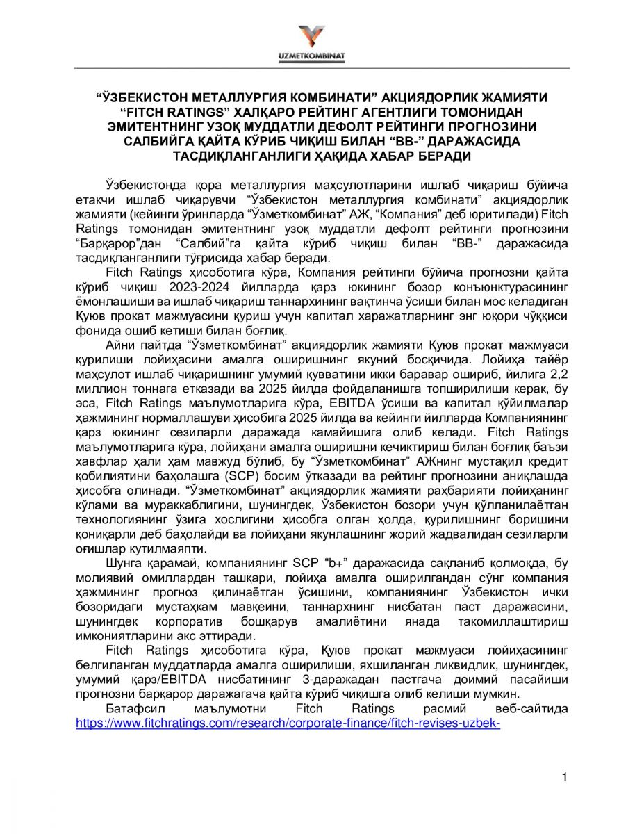 Fitch Ratings hisobotiga ko‘ra, Kompaniya reytingi bo‘yicha prognozni qayta ko‘rib chiqish 2023 - 2024-yillarda qarz yukining bozor konyunkturasining yomonlashishi va ishlab chiqarish tannarxining vaqtincha o‘sishi bilan mos keladigan Quyuv- prokatlash majmuasini qurish uchun kapital xarajatlarning eng yuqori cho‘qqisi fonida oshib ketishi bilan bog‘liq.