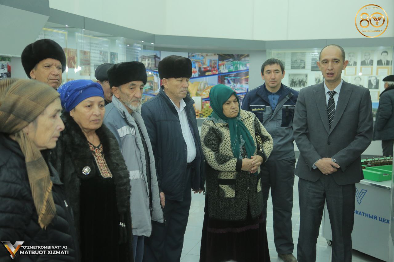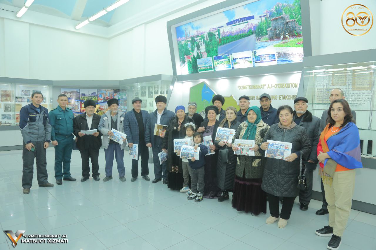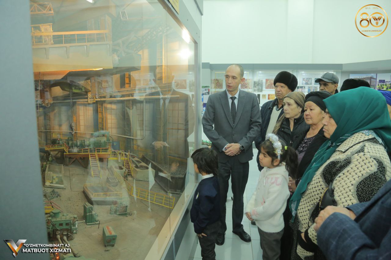 Muzeyga kelgan mehmonlar kombinat tarixiga oid ma'lumotlar bilan yaqindan tanishdilar. Shuningdek, ularga kombinatimizning ishlab chiqarish faoliyati haqidagi videolavhalar namoyish etildi. Mahalla a'zolari kombinat haqida yetarlicha taassurotlarga ega bo‘ldilar. Mehmonlarga kombinat tarixiga oid kitoblar, ko‘p nusxali "Metallurg minbari" va "За mеталл" gazetalari taqdim etildi.