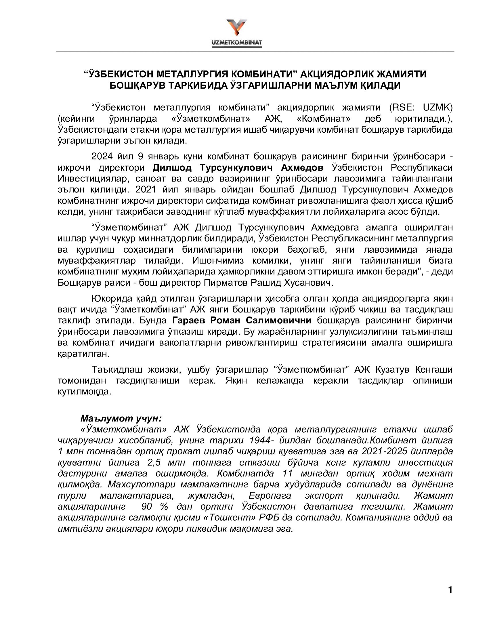 Yuqorida qayd etilgan o‘zgarishlarni hisobga olgan holda aksiyadorlarga yaqin vaqt ichida "O‘zmetkombinat" AJ yangi boshqaruv tarkibini ko‘rib chiqish va tasdiqlash taklif etiladi. Bunga Roman Salimovich Garayevni Boshqaruv raisining birinchi o‘rinbosari lavozimiga o‘tkazish kiradi. Bu jarayonlarning uzluksizligini ta'minlash va kombinat ichidagi vakolatlarni rivojlantirish strategiyasini amalga oshirishga qaratilgan.