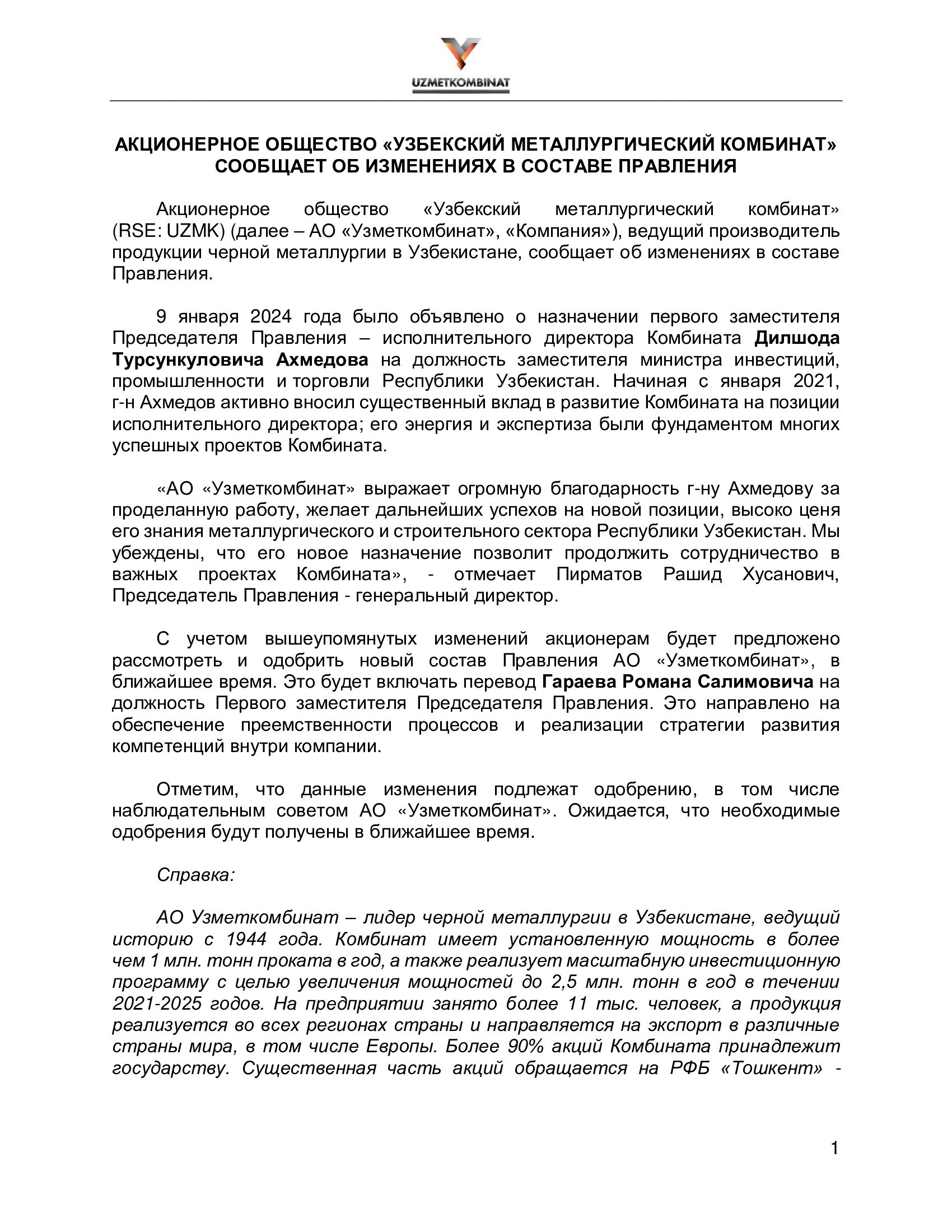 9 января 2024 года было объявлено о назначении первого заместителя Председателя Правления – исполнительного директора Комбината Дилшода Турсункуловича Ахмедова на должность заместителя министра инвестиций, промышленности и торговли Республики Узбекистан. Начиная с января 2021, г-н Ахмедов активно вносил существенный вклад в развитие Комбината на позиции исполнительного директора; его энергия и экспертиза были фундаментом многих успешных проектов Комбината.