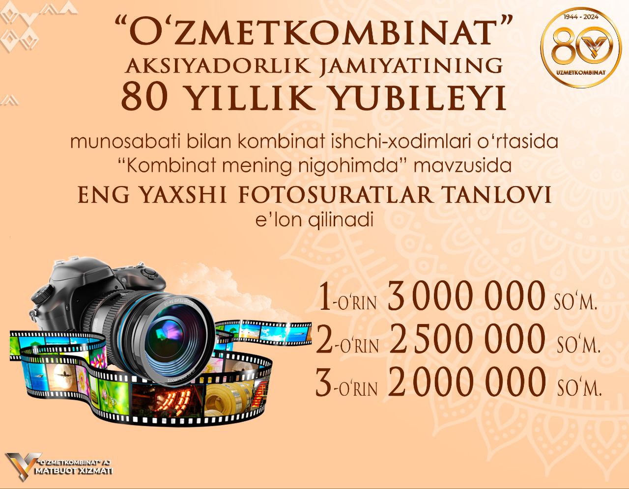 "O‘zmetkombinat" AJning 80 yillik yubileyi munosabati bilan kombinat ishchi-xodimlari o‘rtasida "Kombinat mening nigohimda" mavzusida eng yaxshi fotosuratlar tanlovi e'lon qilinadi.