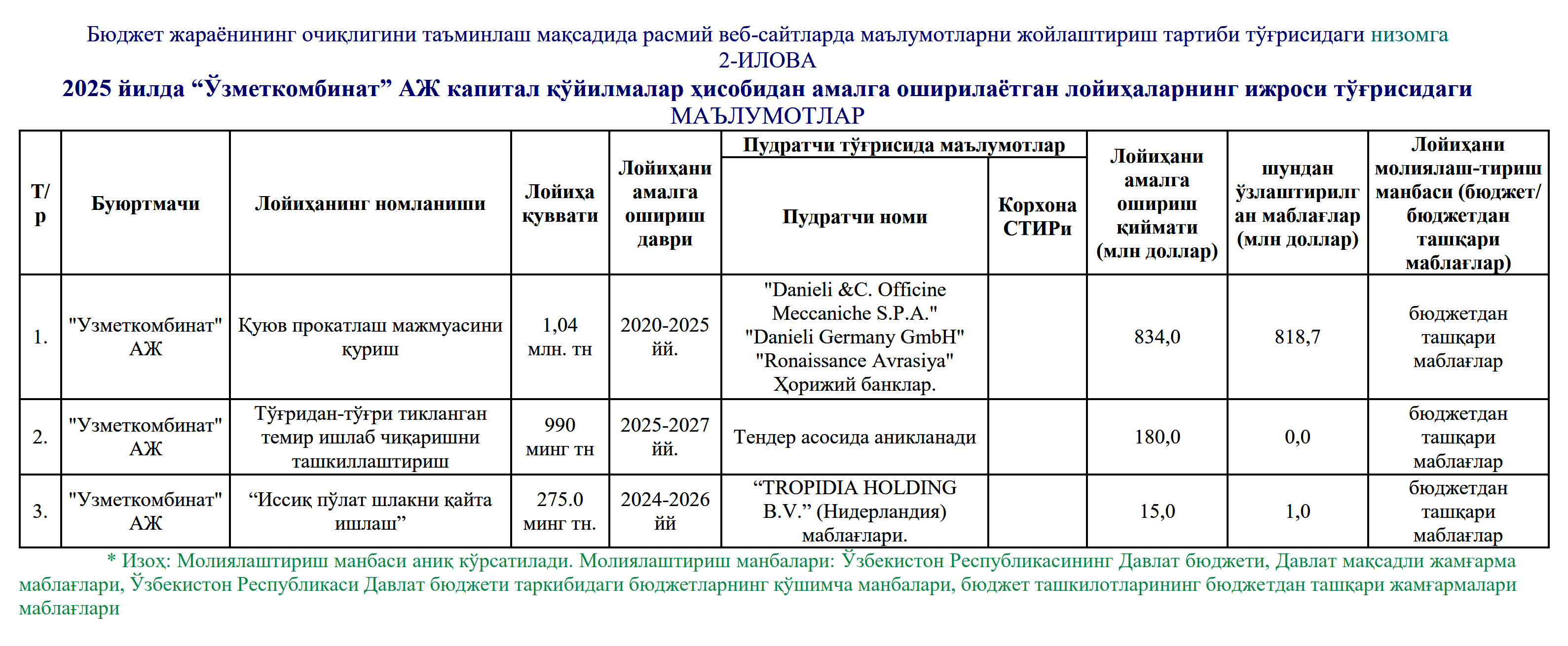 2025-yilda Kapital qo‘yilmalar hisobidan amalga oshirilayotgan loyihalarning ijrosi to‘g‘risidagi ma’lumotlar