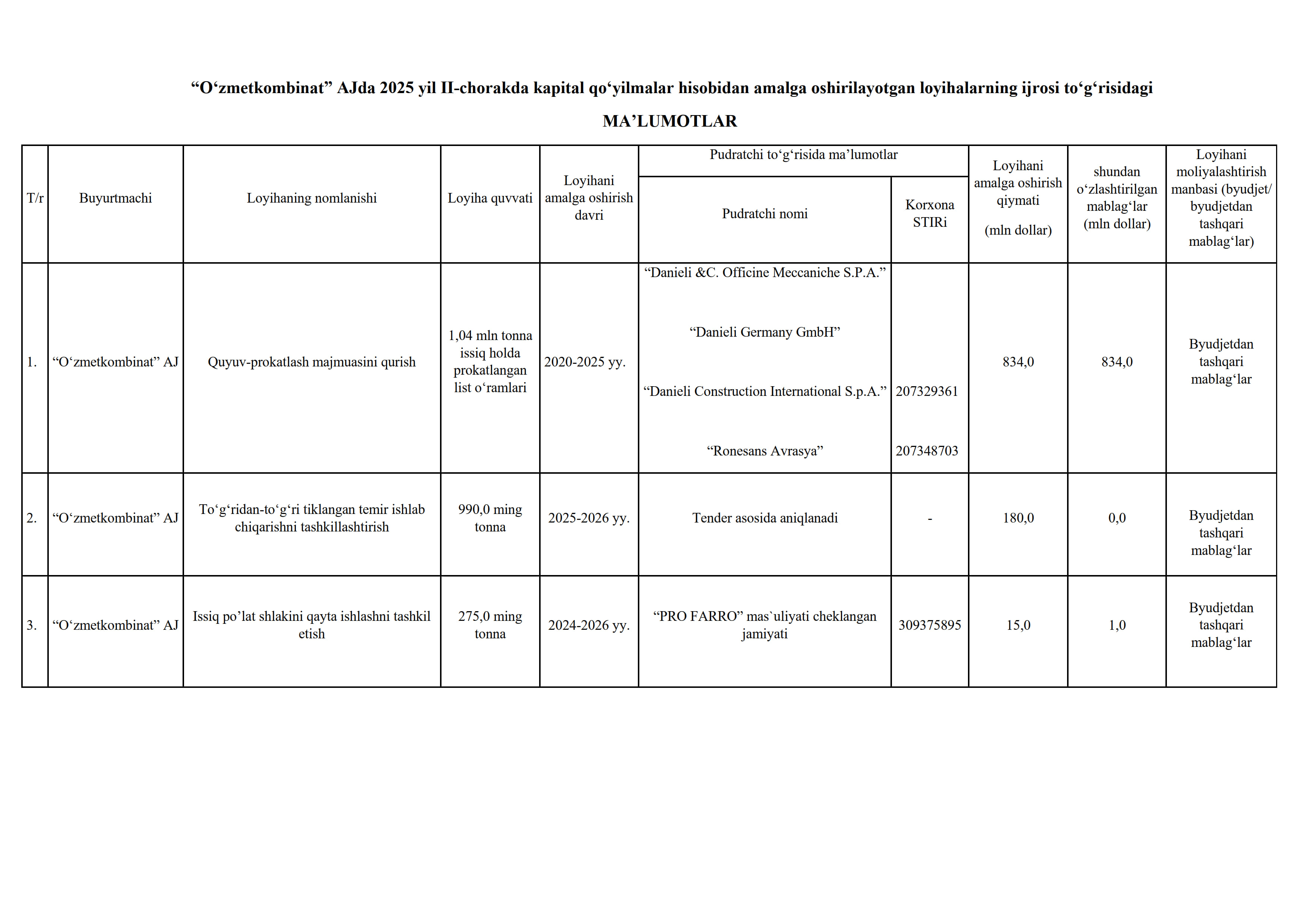 Шартнома рақами ва санаси: «Ronesans Avrasya» (Туркия) 2745-01/03/08/2019 - сонли 09.12.2019й., «Danieli Construction» (Италия) 1815-48/2020 – сонли 30.09.2020й., «Danieli & C. Officine Meccaniche» (Италия) 25012019 – сонли 25.01.2019й., «Danieli Germany» (Германия) 26012019 – сонли 25.01.2019й., «AVIC» (ХХР) Lots-50912-22HW868653 – сонли 28.04.2022й., «Henan Zoke Crane» (ХХР) 3396-01/03/03/01/2022 – сонли 08.06.2022й., «Shanghai Sunshine Industrial Co., Ltd» (ХХР) 2513-48/2023 - сонли 08.05.2023й.