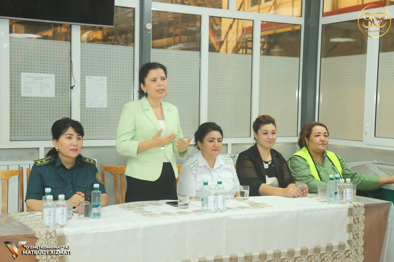 6 августа АО «Узметкомбинат» посетила делегация руководящих женщин во главе с заместителем хокима Ташкентской области Зухры Миргазиевой, организованная при поддержке Управления семьи и женщин области. Цель визита — познакомиться с условиями труда женщин на комбинате и обсудить вопросы их прав, обязанностей и создаваемых условий.