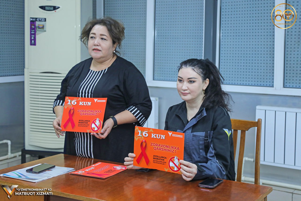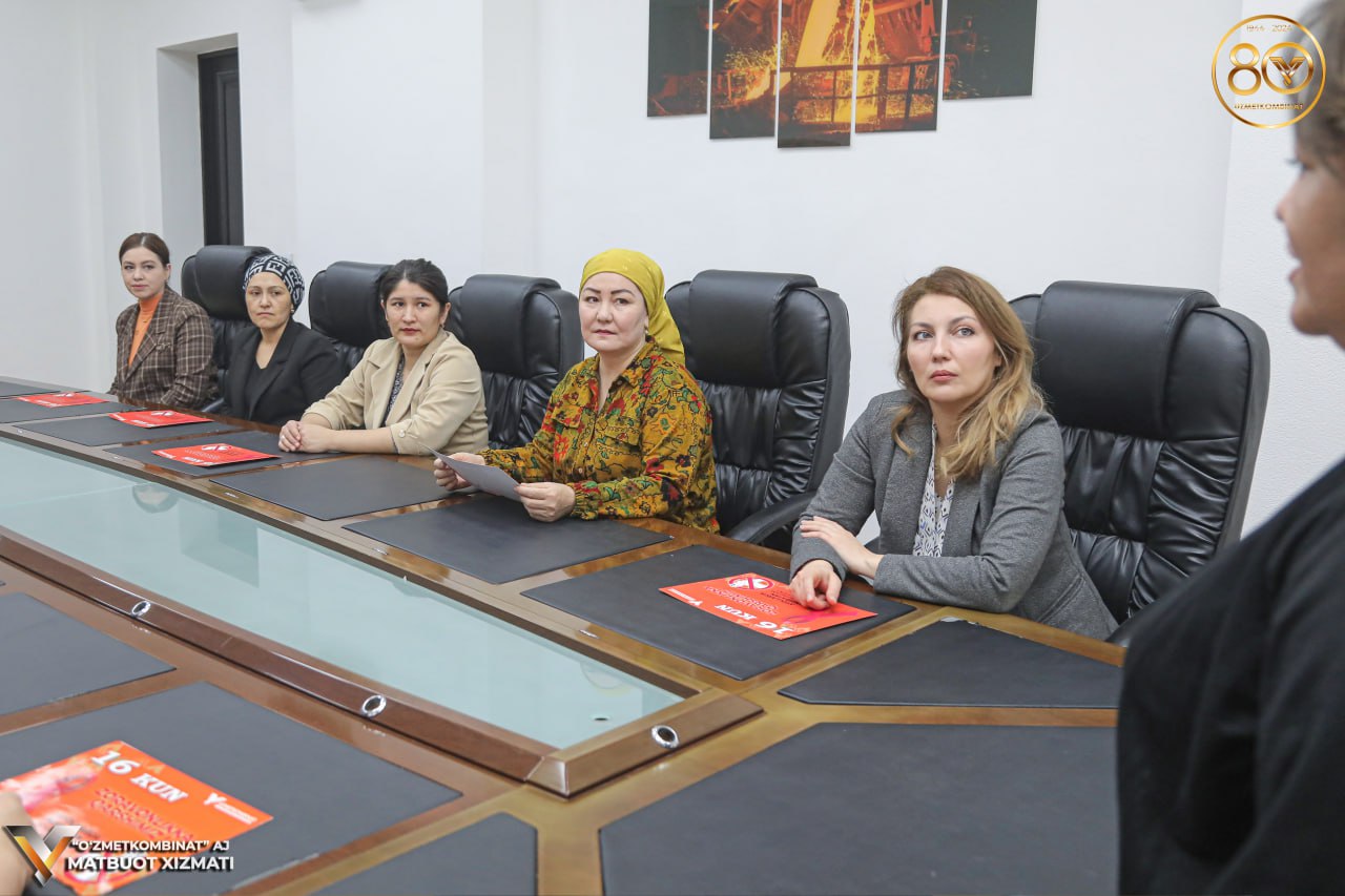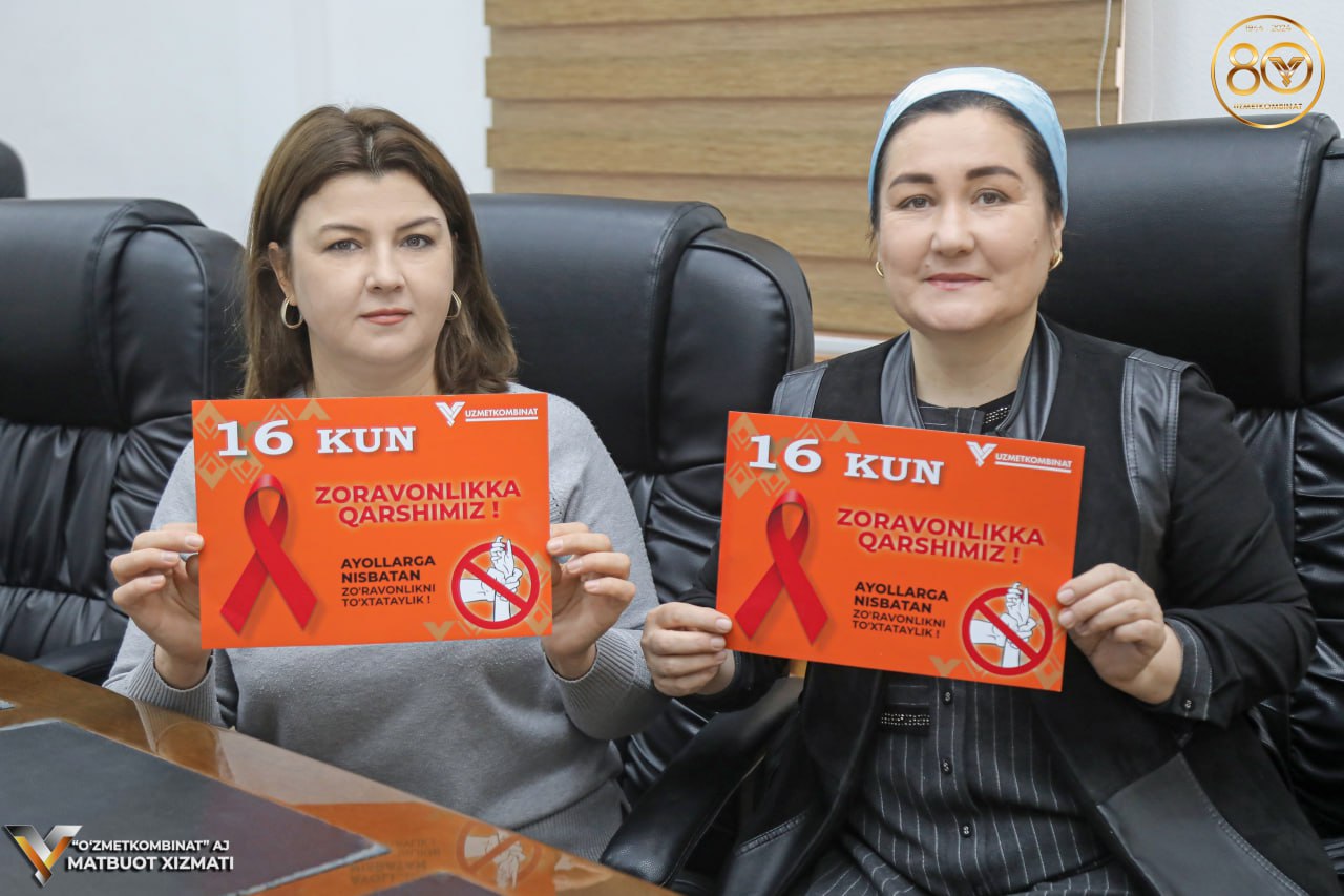 Ushbu tadbirlarning maqsadi — mavjud muammolarni tahlil qilish, bu borada keng jamoatchilik vakillari, mutaxassislar, xalqaro tashkilotlar va boshqa shu sohaga aloqador insonlar fikrini o‘rganish, davlat tomonidan amalga oshirilishi lozim bo‘lgan vazifalarni belgilash, inson huquqlarini ta’minlash yo‘lida barchani birlashtirishdan iboratdir. “O‘zmetkombinat” AJning Xalq iste’moli mollari ishlab chiqarish bo‘linmasida va kombinat ijroiya apparati majlislar zalida ham «Zo‘ravonlikka qarshi 16 kun faollik» tadbirlari doirasida xotin-qizlar o‘rtasida davra suhbati bo‘lib o‘tdi. Unda kombinat ayollar kengashi raisi Marhabo Xoliqova, Ma’naviy-ma’rifiy ishlar samaradorligini oshirish, davlat tili to‘g‘risidagi qonun hujjatlariga rioya etilishini ta’minlash masalalari bo‘yicha maslahatchisi Nigora Ataxanova so‘zga chiqib, qisqa muddatda amalga oshirilgan ishlar va bugungi natijalarimiz — bu borada qilinishi zarur bo‘lgan haqiqiy faoliyatga dastlabki qadam ekanligi haqida fikrlarini bildirib o‘tdi. Qolaversa, suhbat davomida bu yo‘nalishda hali muammolar yetarlicha ekanligi, buning uchun barcha mas’ul bo‘lish darkorligi ta’kidlandi.