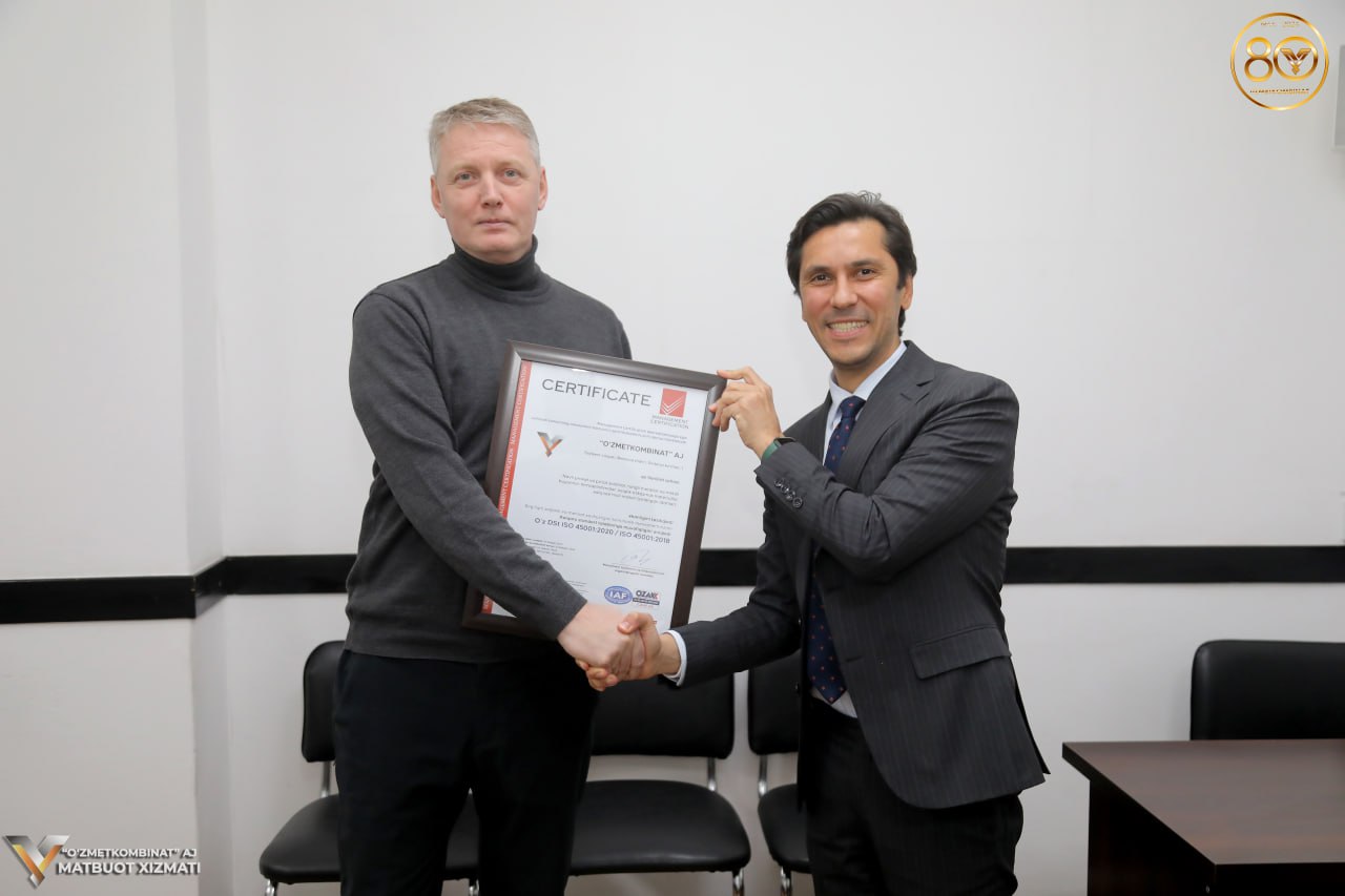 Qayta sertifikatlashtirish tashqi auditning yakuniy natijalariga ko‘ra Menejment tizimlarini sertifikatlashtirish organi kengashi nomidan "O‘zmetkombinat" AJ Sanoat xavfsizligi va mehnat muhofazasi talablariga muvofiq ekanligi to‘g‘risida Sog‘liqni saqlash va mehnat xavfsizligini ta’minlash menejment tizimi Xalqaro standart talablariga muvofiqligini aniqlab, O‘z DSt ISO 45001:2020 / ISO 45001:2018 sertifikati hamda Mehnat xavfsizligini boshqarish tizimi xalqaro standart talablariga javob beradigan ISO 45001:2018 xalqaro sertifikati berildi.