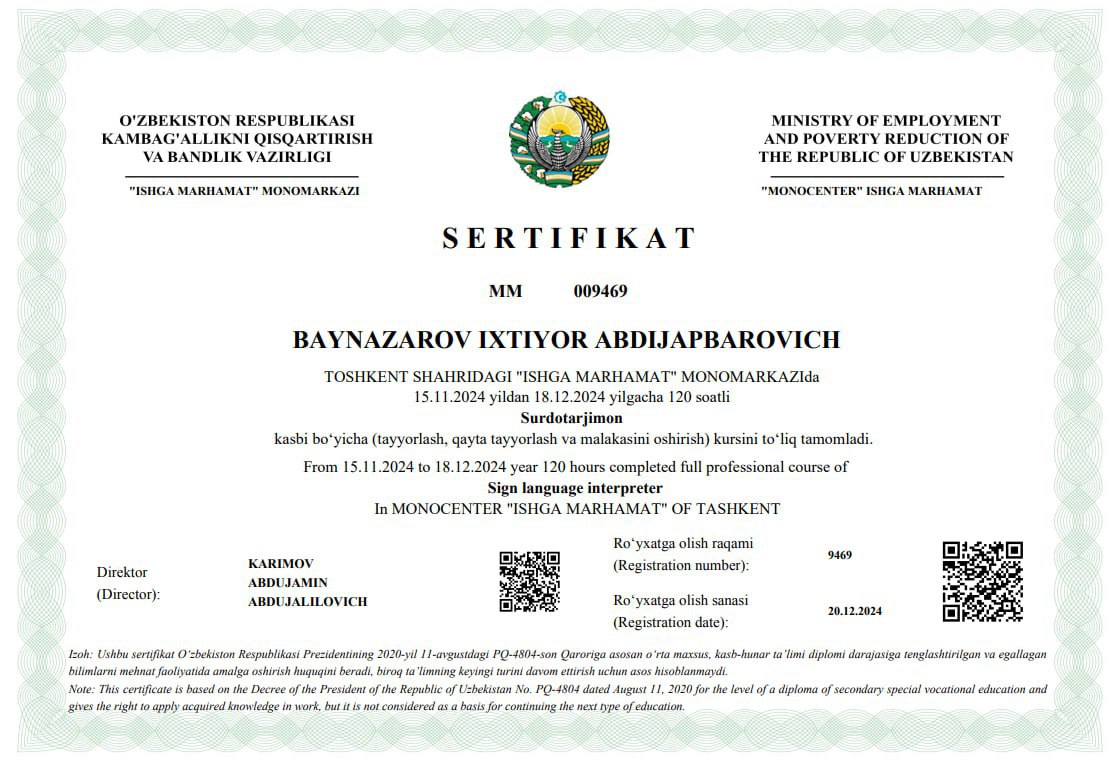 2024-yil 15-noyabrdan 14-dekabrga qadar “O‘zmetkombinat” AJ Ijroiya apparati Hujjatlar tahlili va ijrosini ta’minlash, murojaatlar bilan ishlash boshqarmasi muhandisi I.Baynazarov Toshkent shahridagi "Ishga marhamat" Monomarkazida tashkil etilgan Vazirlik va idoralarning mas’ul xodimlariga Respublika kasbiy ko‘nikmalar markazida imo-ishora muloqoti va surdotarjimonlik ko‘nikmasini shakllantirish o‘quv kursida qatnashdi. Kurs davomida I.Baynazarov imo-ishora muloqoti va surdotarjimonlik ko‘nikmasini shakllantirish yo‘nalishida malakasini oshirdi. O‘quv kursi dasturini yaxshi o‘zlashtirgan kombinatimiz vakili test sinov imtihonlarini a’lo baholarga topshirib O‘zbekiston Respublikasi Kambag‘allikni qisqartirish va bandlik vazirligi Toshkent shahar "Ishga marhamat" Monomarkazining sertifikatini qo‘lga kiritdi.