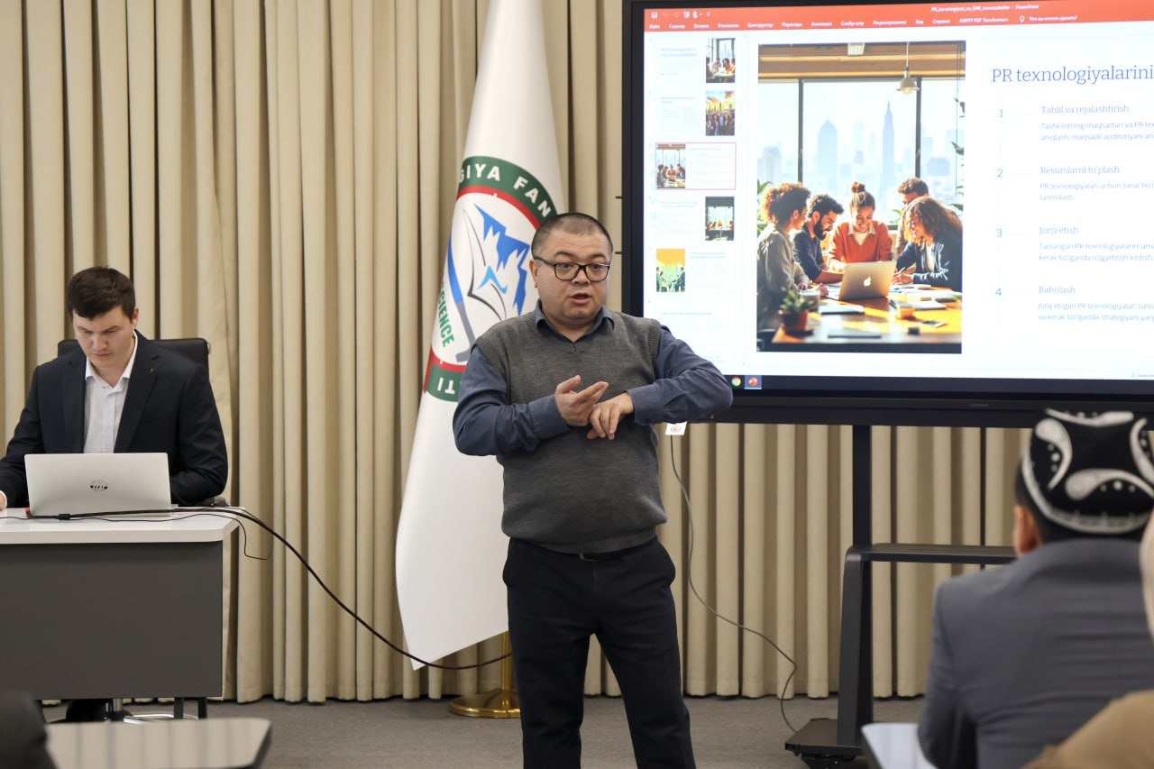 O‘zbekiston Respublikasi Prezidenti Administratsiyasi huzuridagi Axborot va ommaviy kommunikatsiyalar agentligi bo‘lim boshlig‘i M. Parpiyev, PR-xizmatlar faoliyati, matbuot pullini to‘g‘ri tashkil etish, PR-strategiya tuzish, inqirozli vaziyatlarda maqbul yechimlar topish bo‘yicha taqdimot qildi.