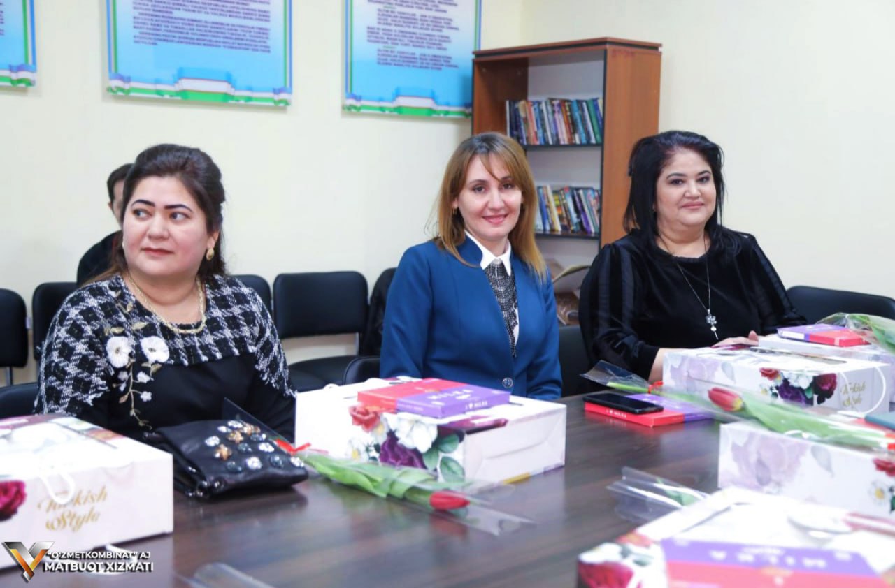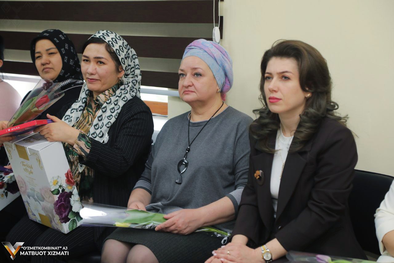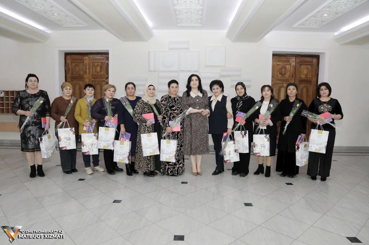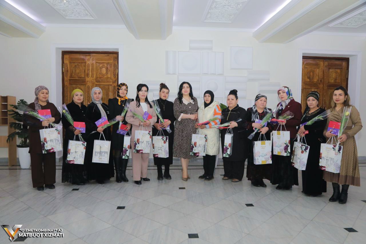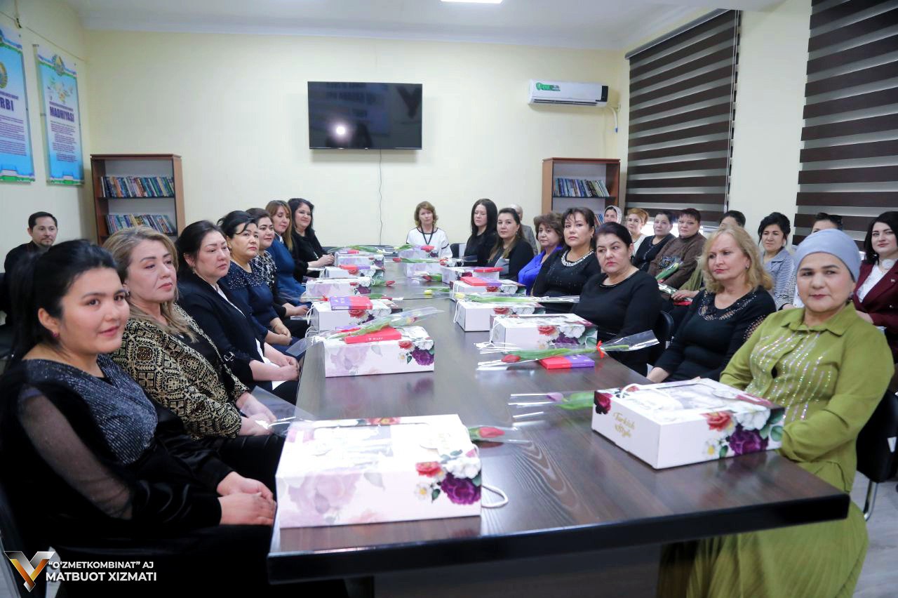 8-mart - Xalqaro xotin-qizlar kuni bayrami munosabati bilan kombinatda ko‘p yillar munosib mehnat qilib kelayotgan bir guruh ayollarni kombinat Kasaba uyushmasi qo‘mitasi tomonidan taqdirlanishdi. Dastlab, tadbir boshlanishida kombinat Kasaba uyushmasi qo‘mitasi raisi Elzara Veliullayeva barcha ayollarga samimiy tilaklarini bildirib, kombinat tarkibiy bo‘linmalaridagi jamoa oldilariga qo‘yilgan reja va topshiriqlarni bajarilishida albatta metallurg xotin-qizlarimizning xizmatlari katta ekanligini ta’kidlab o‘tib, barchaganing oilalariga xotirjamlik va hamisha sog‘-salomat bo‘lishlarini tiladi.
