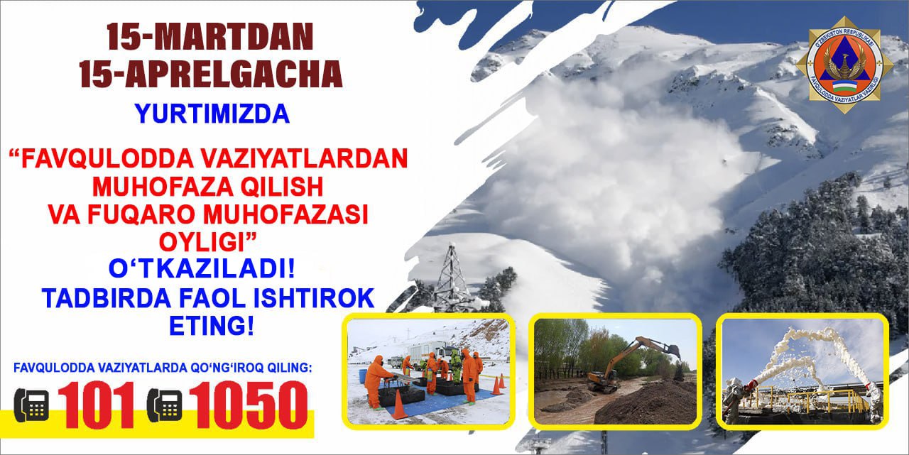 Hukumat komissiyasining tegishli bayoniga muvofiq hamda, «O‘zmetkombinat» AJning 2025-yil 17- martdagi 353 i/ch -sonli buyrug‘iga asosan “O‘zmetkombinat” AJ bo‘yicha 2025-yilning 15-mart kunidan 15-aprel kuniga qadar “Favqulodda vaziyatlardan muhofaza qilish va fuqaro muhofazasi oyligi” o‘tkazilmoqda.