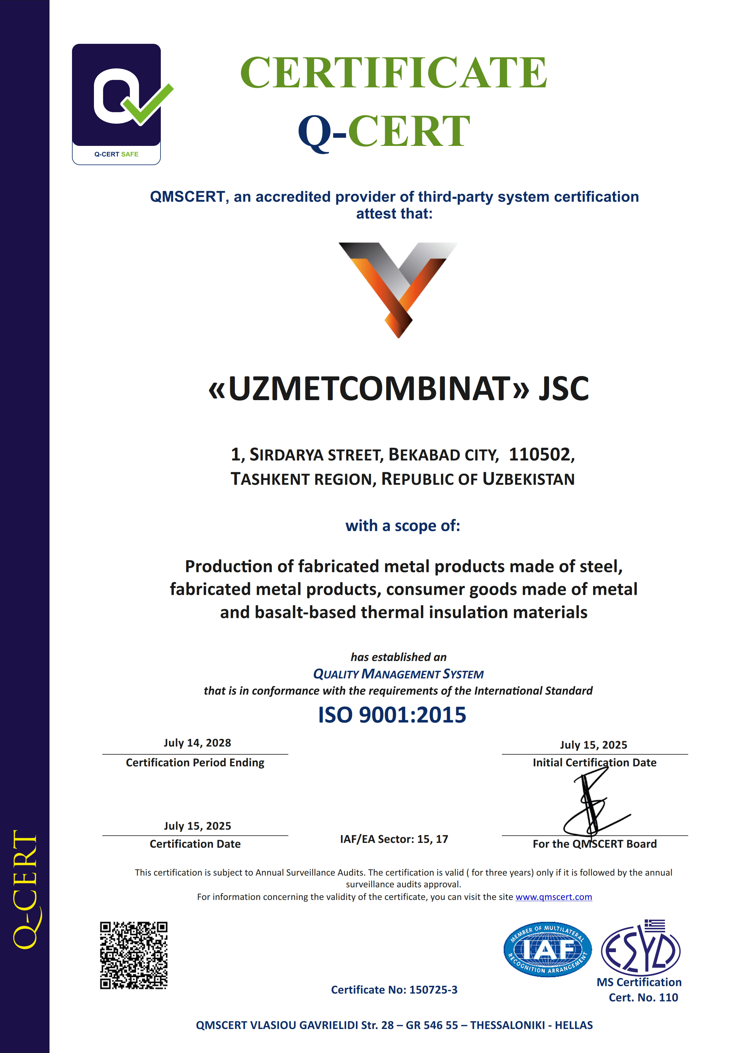 «O’zmetkombinat» AJ ISO 9001:2015, ISO 45001:2018 va ISO 50001:2018 xalqaro standartlari talablariga muvofiq menejment tizimlarini integratsiyalash ishlarini muvaffaqiyatli yakunladi.
