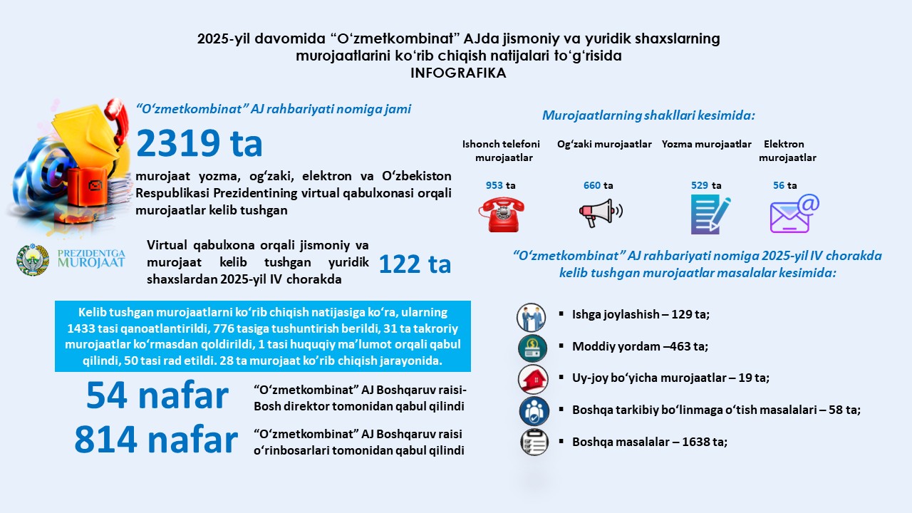 "O‘zmetkombinat" AJga 2025-yil yanvar-dekabr oylari davomida kelib tushgan murojaatlar to‘g‘risida