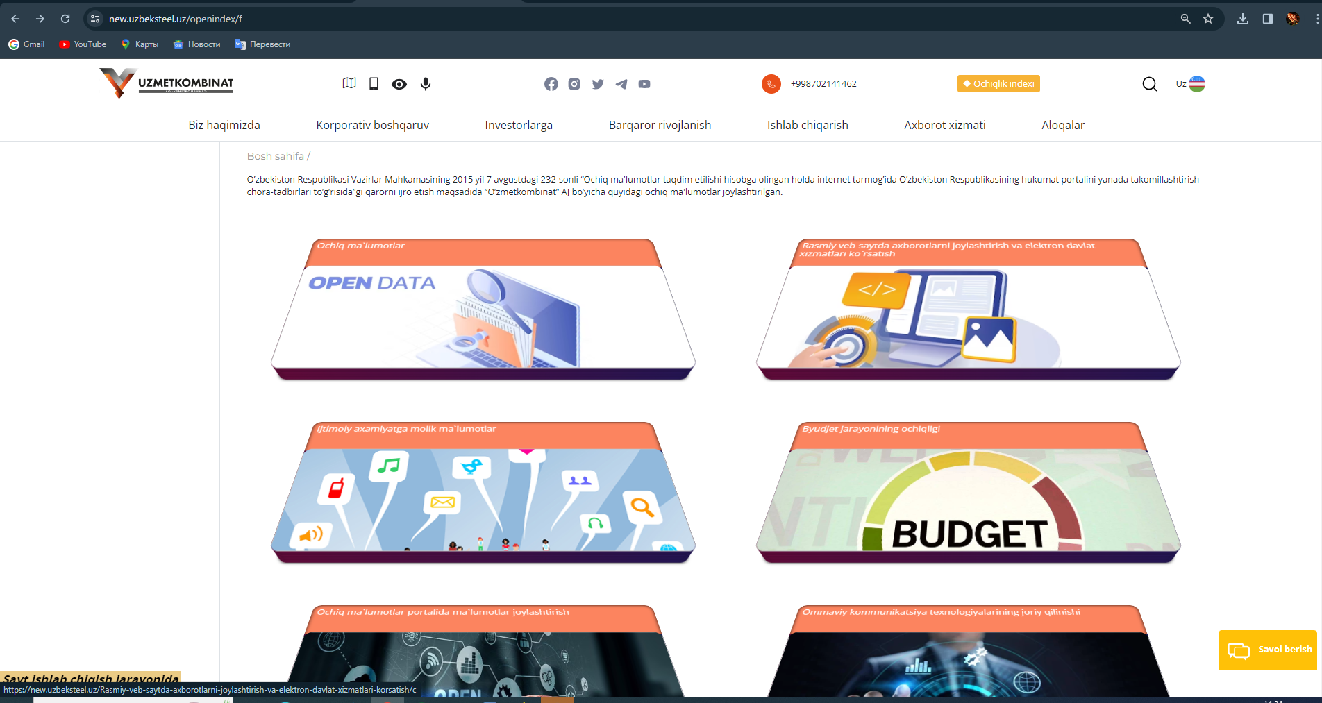 “O’zmеtkombinat” AJ bo’yicha dolzarb mavzularga oid ma'lumotlar rasmiy veb-saytning asosiy oynasida Ochiqlik indeksi bo'limiga joylashtirilgan.