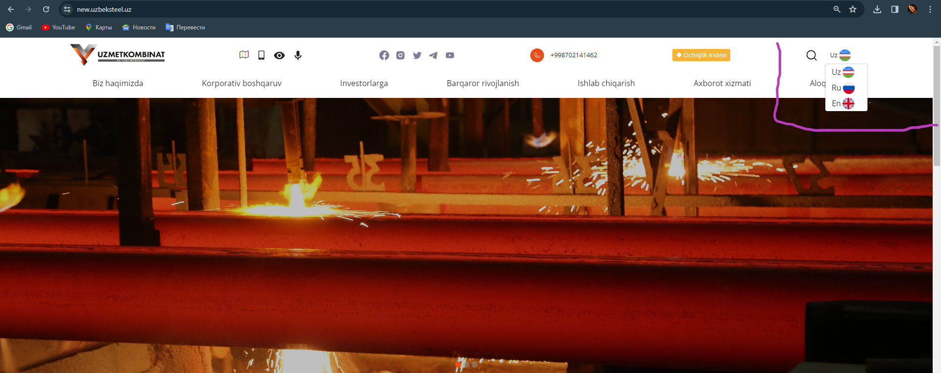 " O'zmetkombinat "AJ rasmiy veb-saytida ma'lumotlarni boshqa tillarga sinxronlash funksiyasi mavjud bo'lib u asosiy oynada joylashtirilgan