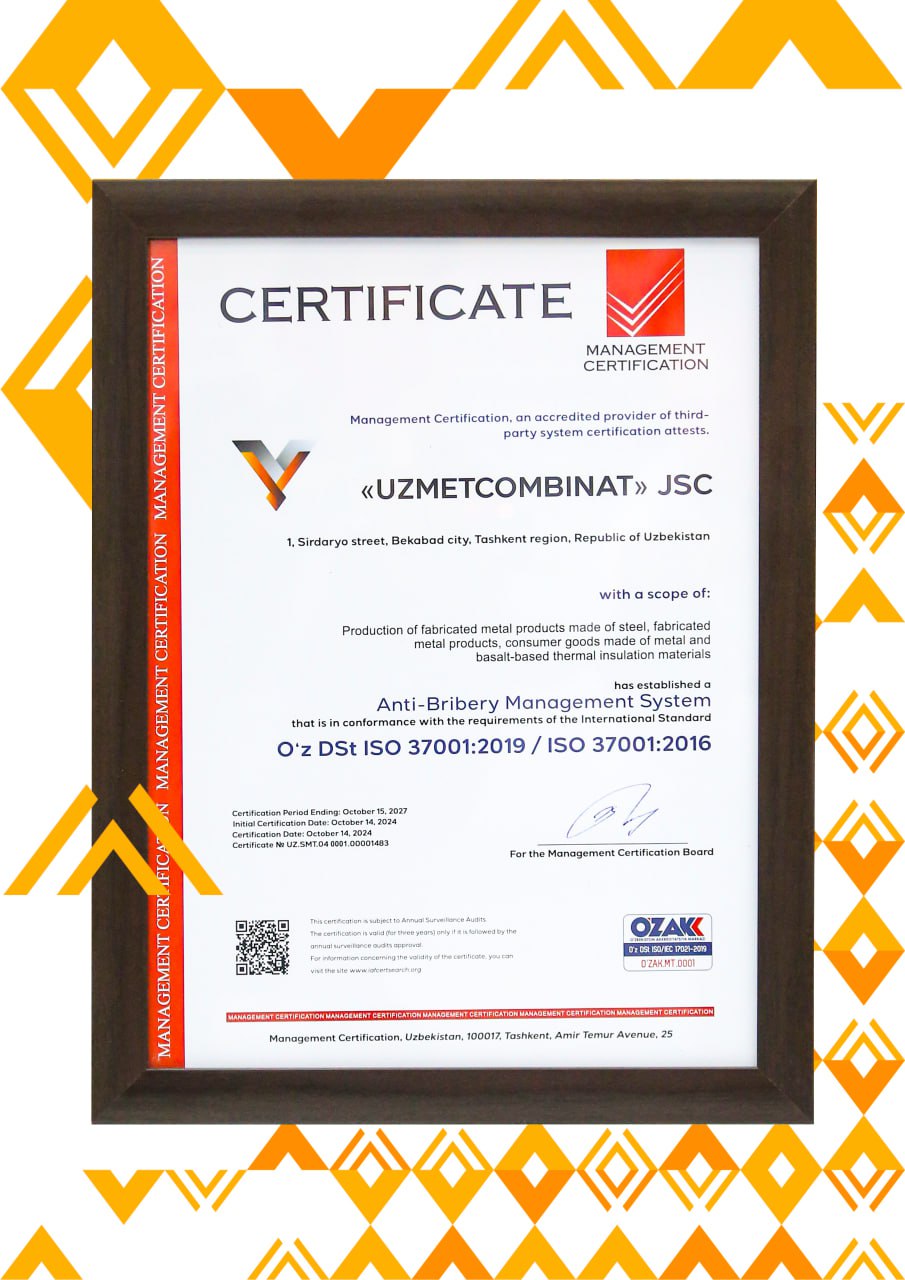 ISO 37001:2016 va O‘z DSt ISO 37001:2019 sertifikatlari shunchaki hujjat emas, balki “O'zmetkombinat” AJning halollik, ahloq qoidalari va mas’uliyatning jahon hamda milliy standartlariga amal qilayotganini tasdiqlovchi dalildir.